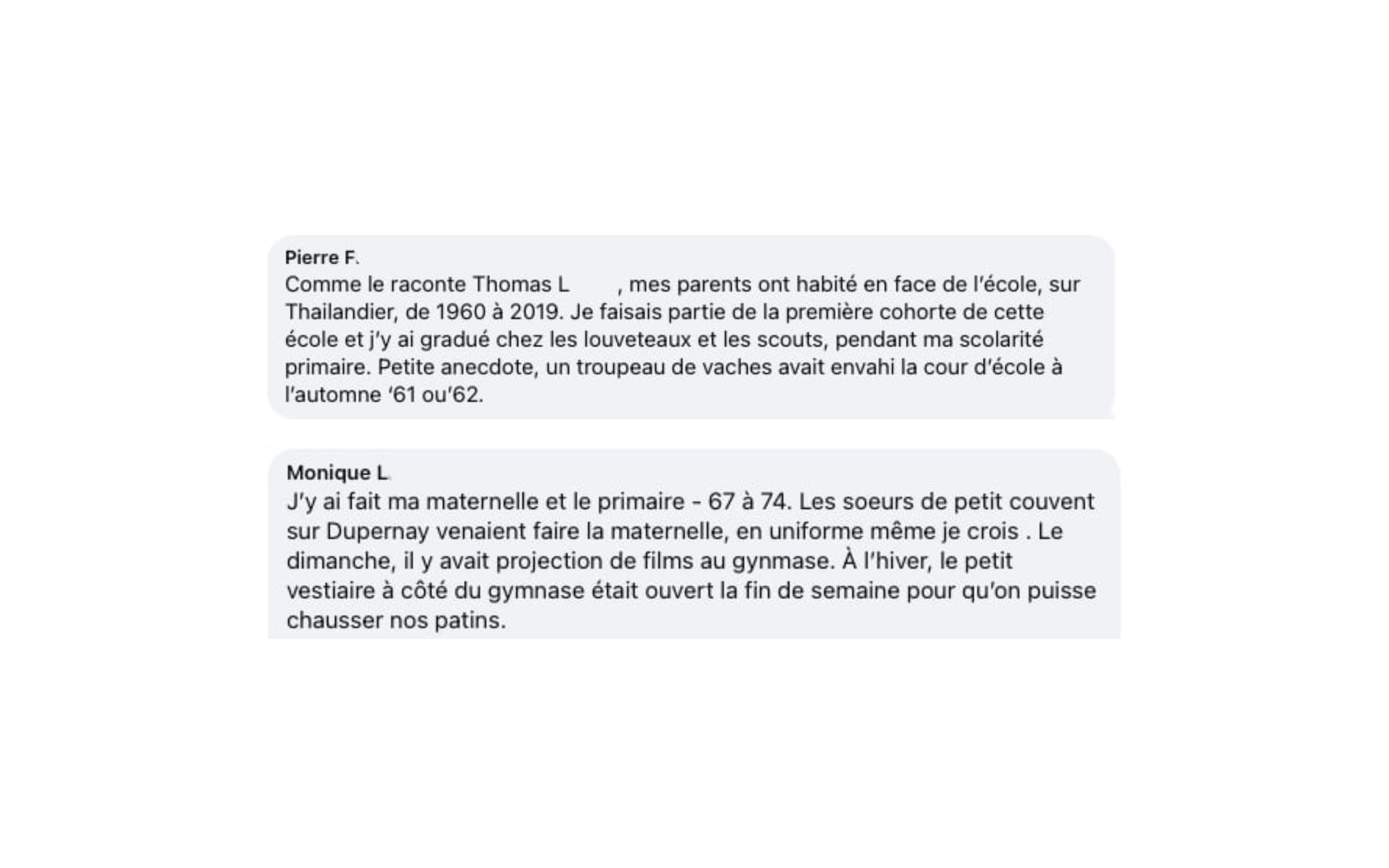 « Ce fut-là le premier centre culturel bouchervillois. Grand-père Caillou, vedette d'une émission à Radio-Canada, y donnait des cours aux petits de Boucherville et des alentours. Je me souviens d'avoir vu le comédien Robert Rivard venir y chercher son enfant; peut-être Michel? »